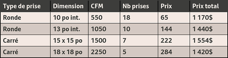 Si votre ventilateur pousse 10 000 CFM, selon la dimension de vos prises d’air, ça vous prend :