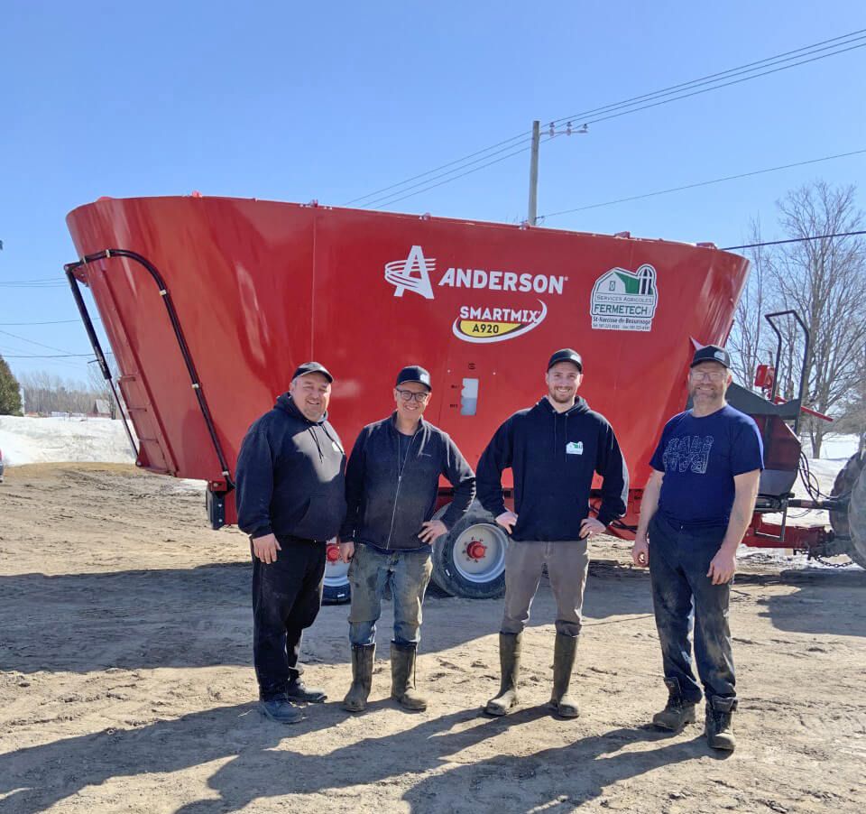 Les dirigeants de cette ferme de 3e génération avaient comme objectif de réduire le temps consacré à la préparation et à la distribution de la ration totale mélangée (RTM) et de la litière sur leurs deux sites d’élevage. Pour ce faire, ils avaient besoin d’un équipement mobile bien chaussé plus gros, plus efficace et plus polyvalent. Ils ont trouvé réponse à leurs besoins grâce à Sébastien Duclos, le propriétaire de Services agricoles Fermetech inc. M. Duclos leur a conseillé un mélangeur Anderson A920 de type traîné, à deux vis, d’une capacité de 920 pieds cubes. Selon lui, il s’agit d’un des meilleurs mélangeurs sur le marché : « Une machine ultra-robuste de fabrication québécoise qui fournit une qualité de mélange constante et dont la cuve est fabriquée avec un métal plus résistant que la moyenne, pour une meilleure durabilité. » Et pour répondre aux besoins précis de la Ferme Rogyver inc., Sébastien Duclos a adapté le mélangeur en lui ajoutant des couteaux afin qu’il puisse aussi servir à hacher la paille. Alors adieu hache-paille en location et adieu vieux mélangeur! La distribution de la RTM et de la litière se fait avec le mélangeur mobile attaché à un tracteur dans les 2 sites d’élevage de la Ferme Rogyver inc., permettant ainsi de libérer plus rapidement les ressources humaines et la machinerie pour les travaux aux champs. Sébastien Duclos a acheté en 2022 le commerce Services Roger Leroux auquel il a donné le nom de Services agricoles Fermetech inc. Située au 508, rang St-Joseph, à Saint-Narcisse-de-Beaurivage, l’entreprise a rapidement pris de l’expansion avec un agrandissement de 6 000 pieds carrés et l’ajout d’un entrepôt de 2 500 pieds carrés. Services agricoles Fermetech inc. vend et installe des produits Anderson, Teamco, Ventec, DCC Waterbeds, Multico, JSB, ADLS, Lacasse, Wic, Canarm, Keenan et Performixx dans les régions de Québec et de Chaudière-Appalaches (Beauce, Lotbinière). Pour certaines marques, le territoire s’étend de Montmagny, à la MRC de Portneuf et aux régions Saguenay–Lac-Saint-Jean et Centre-du-Québec (en partie). L’entreprise compte maintenant 15 employés, dont 9 à temps plein. Le mot d’ordre de Sébastien Duclos? Assurer un service ultra-rapide avec expérience et compétence!